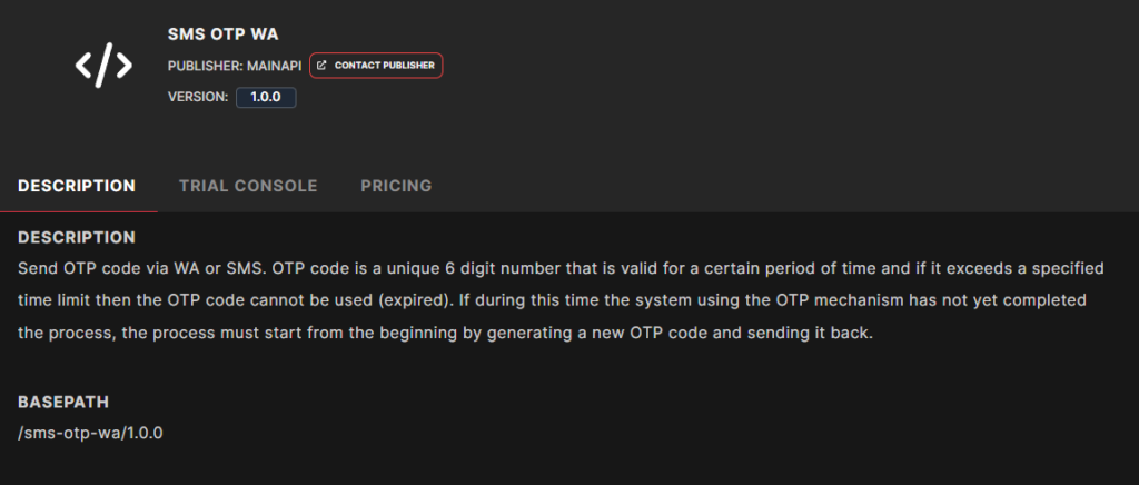 SMS API ini dirancang khusus untuk mengirimkan kode OTP berupa 6 digit angka unik kepada pengguna, melalui WhatsApp maupun SMS.
